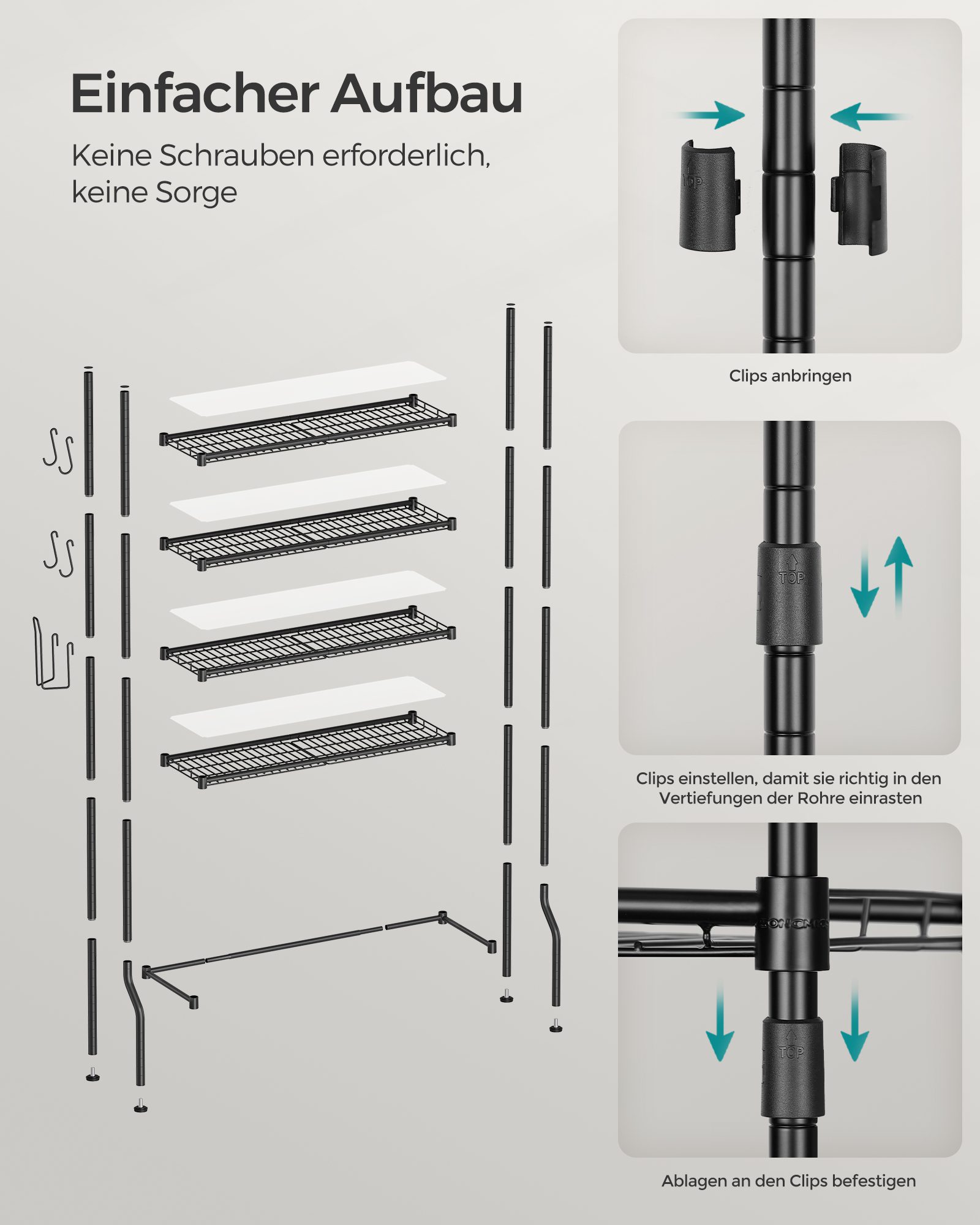 Badrumshylla hörnmodell – teleskop 240–310 cm, 4 hyllor, krokar, rostfritt stål/PP