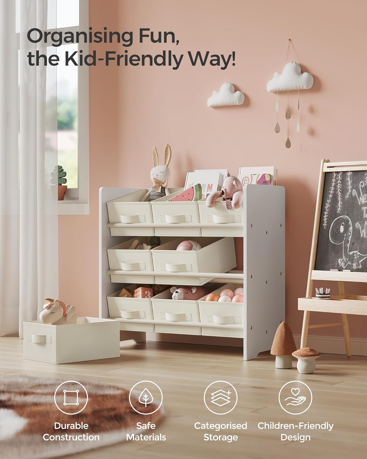 Praktisk barnförvaring i molnvit med 9 tygbackar som gör det enkelt att sortera leksaker, böcker och småsaker