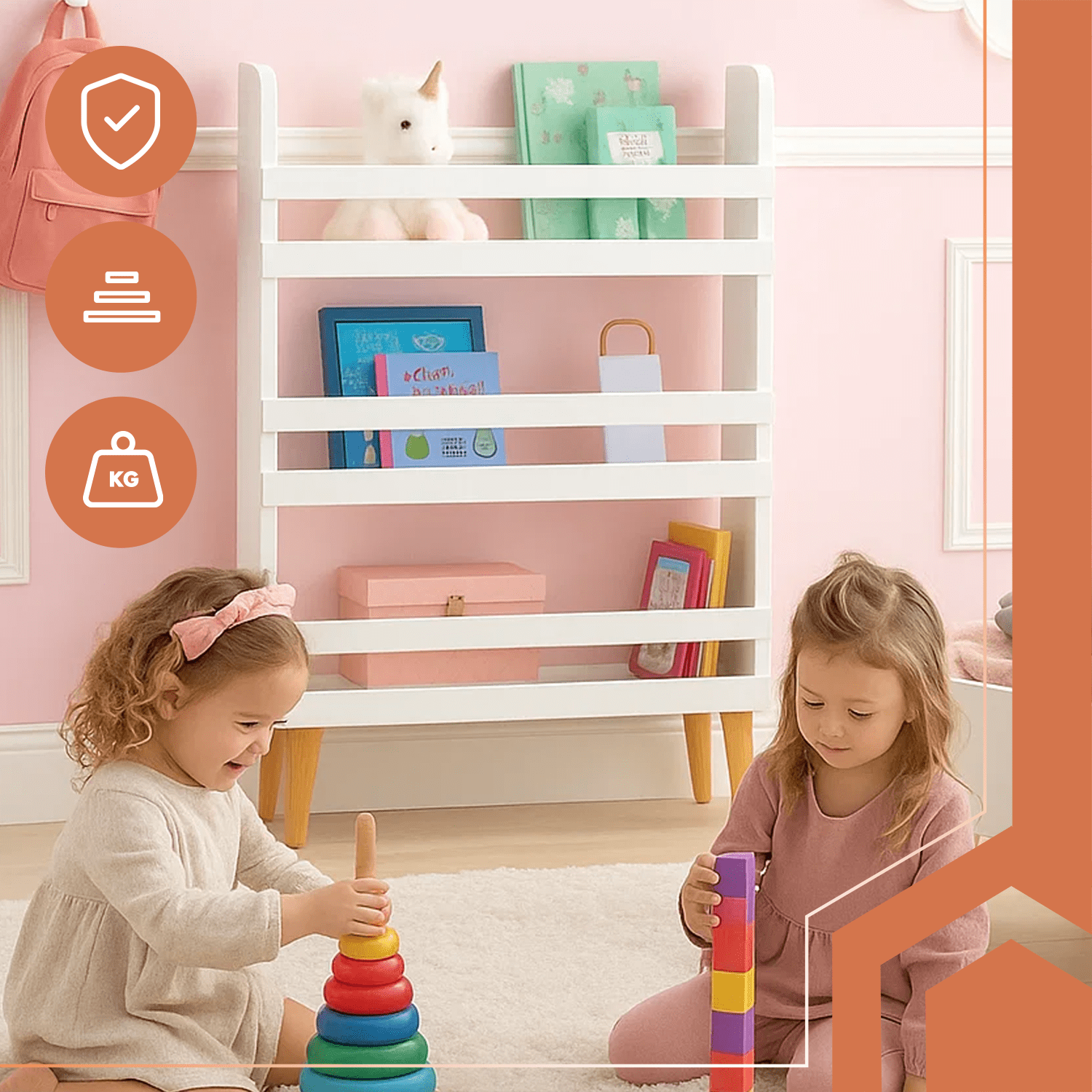 ✔ Förvaringshylla med tre rymliga hyllplan – idealisk för leksaker, böcker, pussel och spel