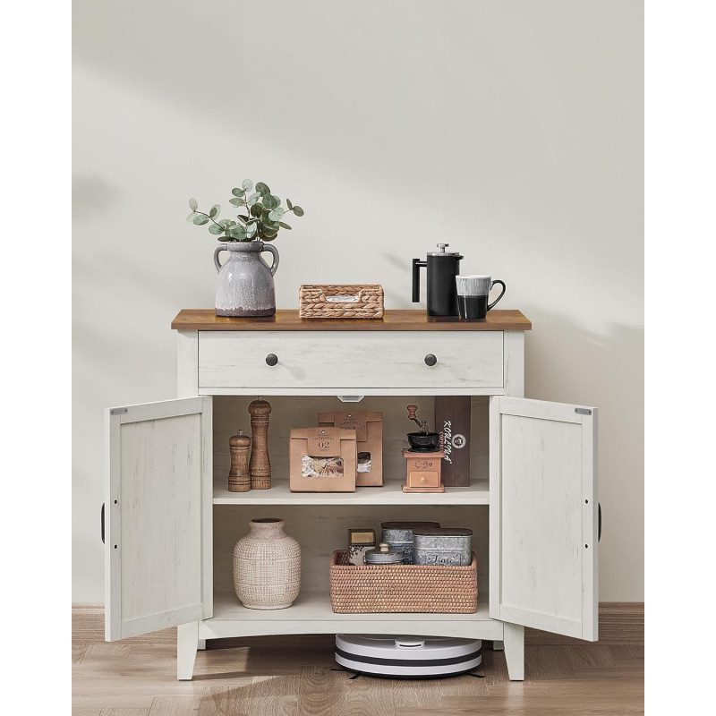 Allround-skänk i lantlig stil med färgkombinationen vintagevit och honungsbrun samt charmiga skjutdörrar – passar som skåp i vardagsrum, bufféskåp i kök/matsal eller konsolbord i hallen