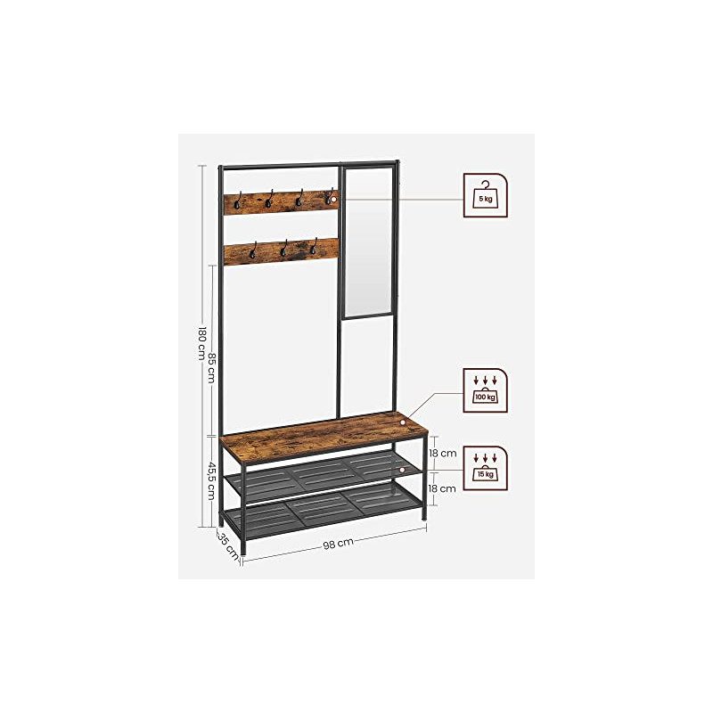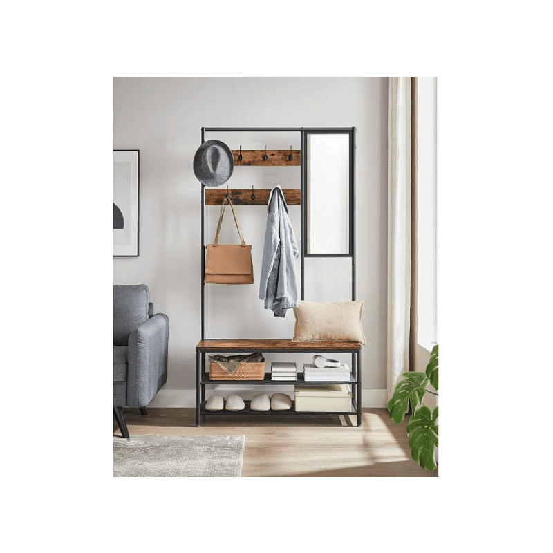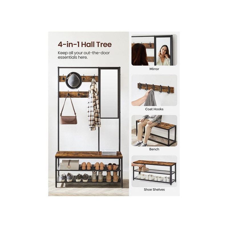 3-i-1 hallklädhängare med 7 krokar, 98 cm sittbänk, spegel samt skoställ med 2 hyllplan