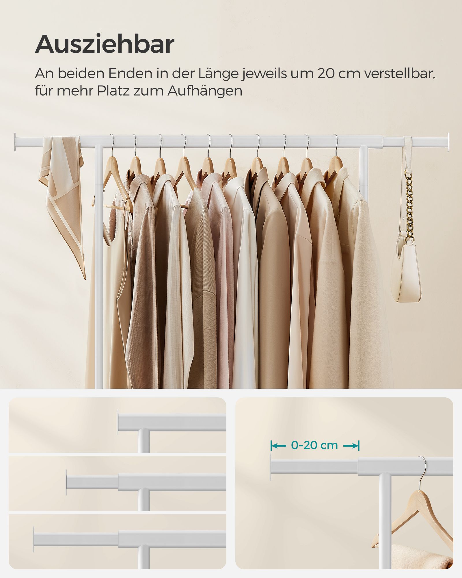 Optimera garderobsförvaringen med ett klädställ på hjul med utdragbar klädstång och max statisk belastning upp till 90 kg.