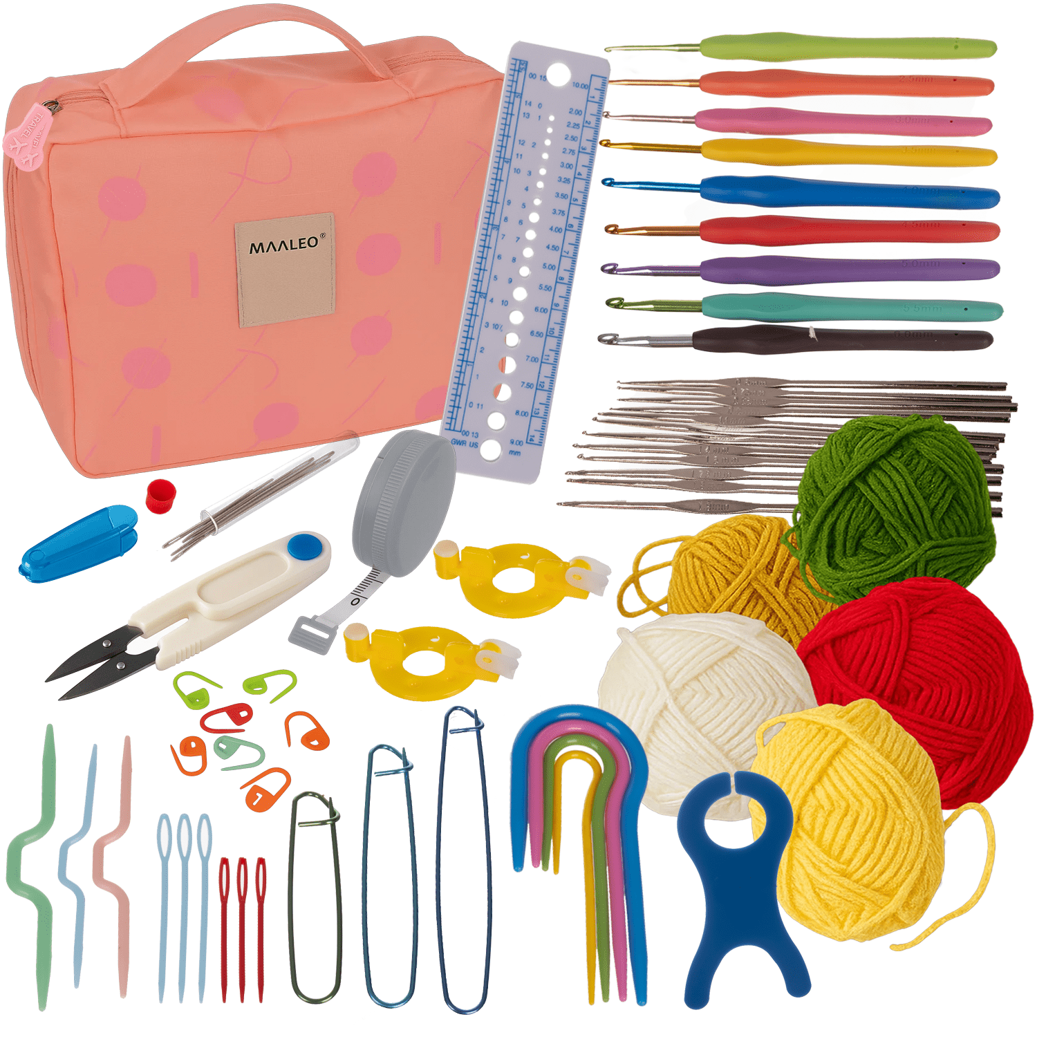 ✔ Förutom virknålarna ingår praktiska tillbehör såsom garnnystan, öglemarkörer, sticknålar, pompom-verktyg, måttband, sax och mycket mer.