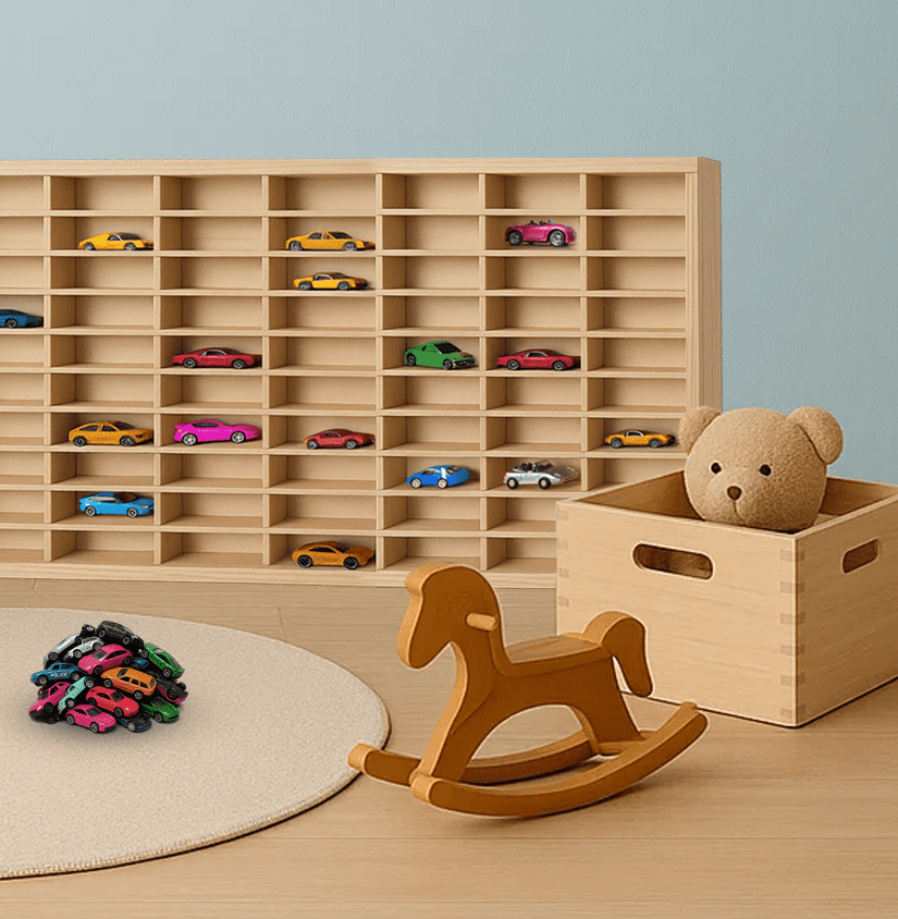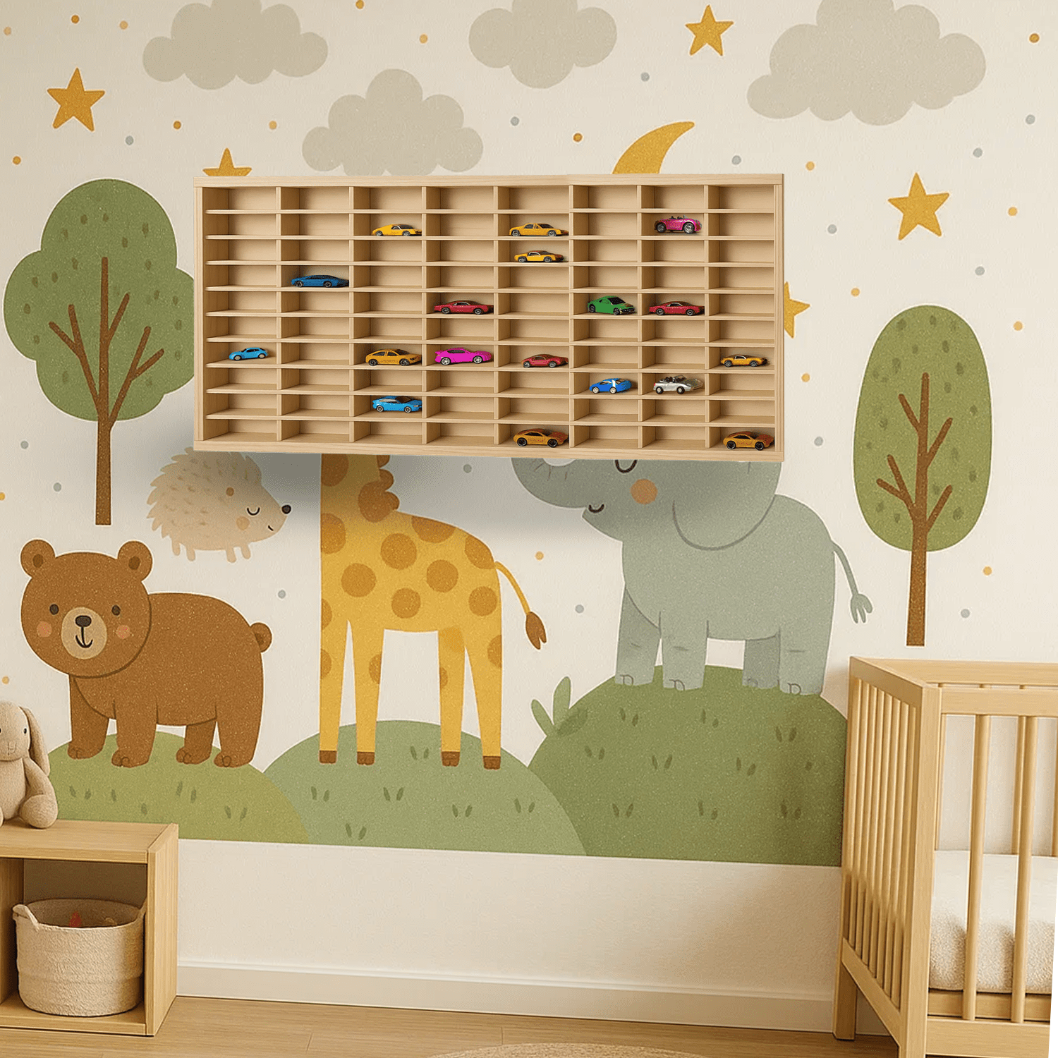 ✔ Med hela 80 fack, noggrant utskurna för att varje bil ska få sin egen plats, rymmer hyllan en komplett samling av leksaksbilar.