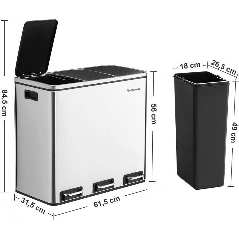 3 innerhinkar med handtag som enkelt kan lyftas ur och tömmas var för sig