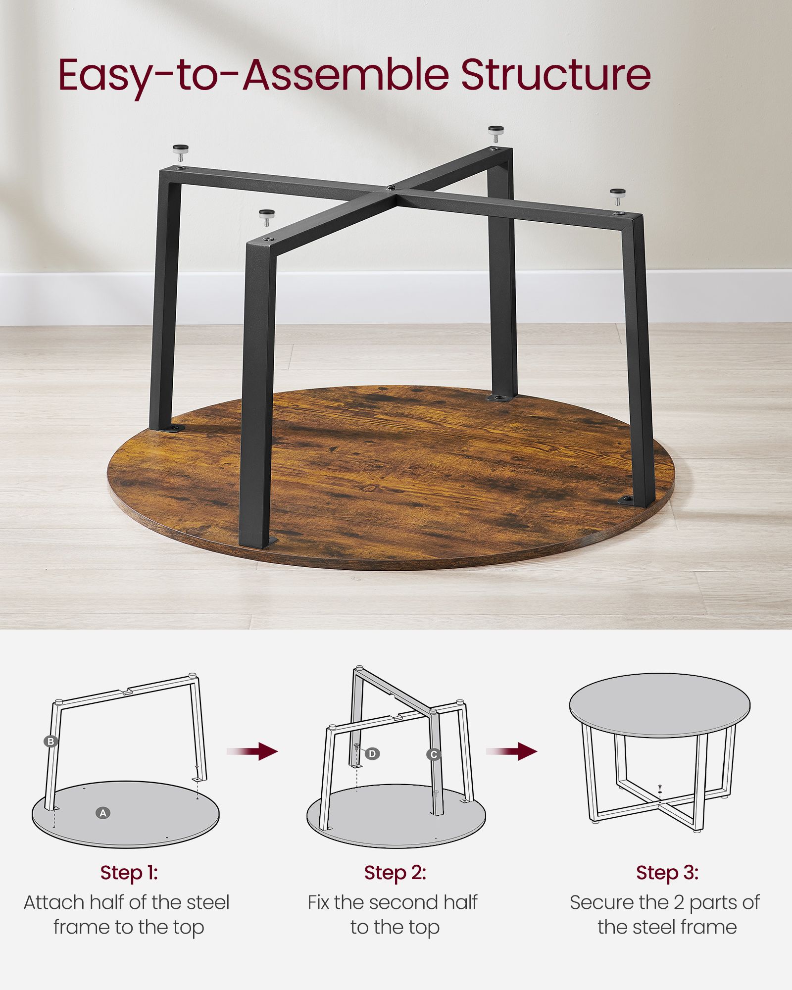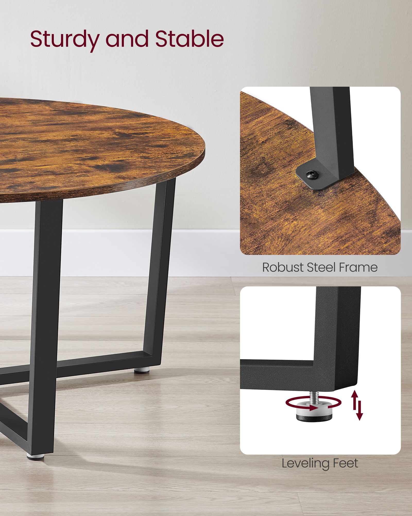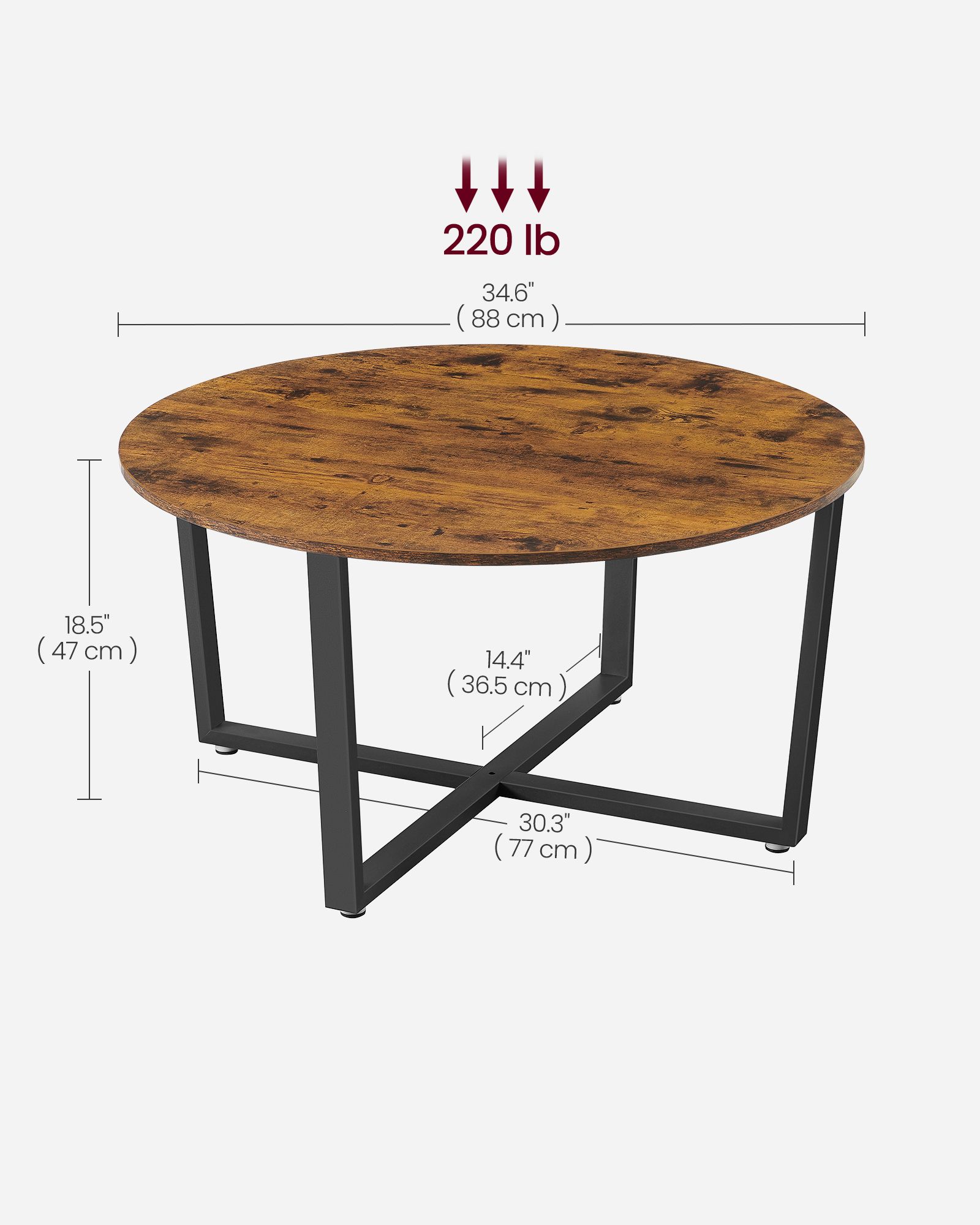 Runt soffbord i industriell stil med brun bordsskiva och stabil järnram