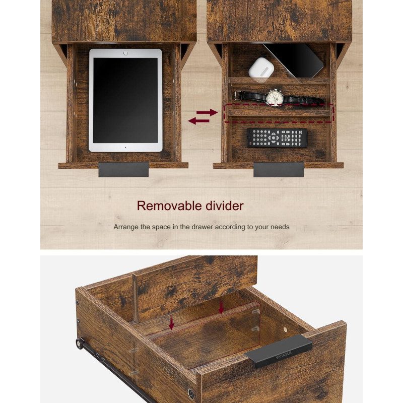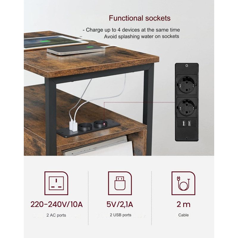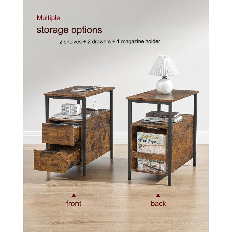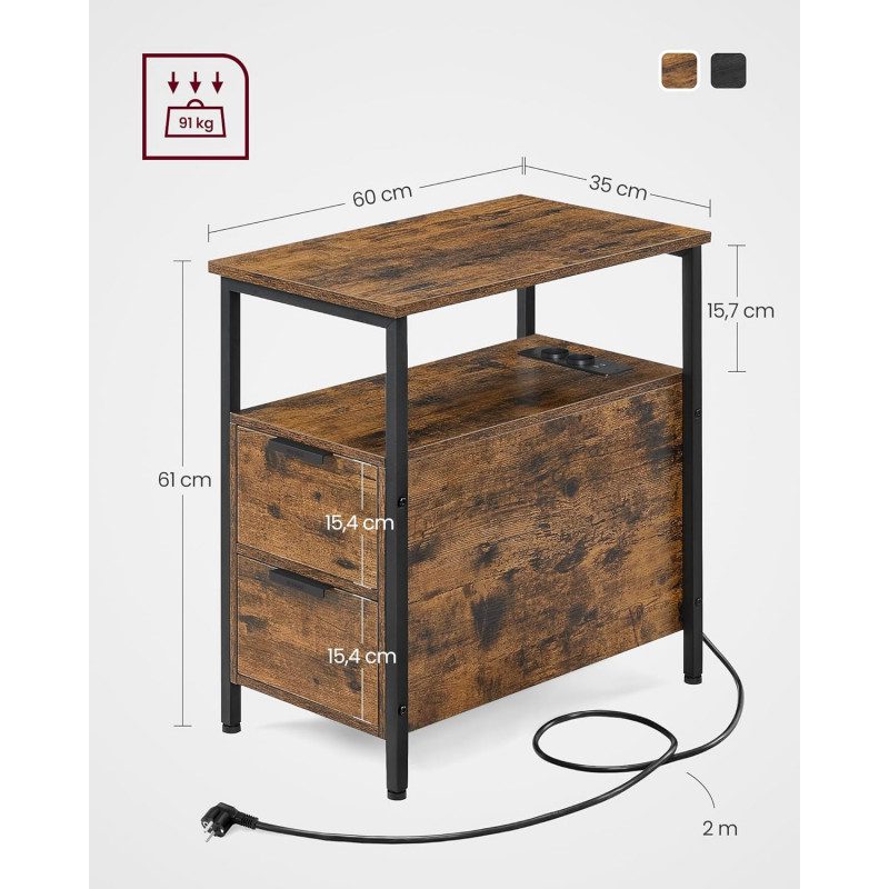 Sidobord/sängbord i industriell stil med laddstation (inbyggt eluttag och USB-laddare) samt 2 lådor för smart förvaring