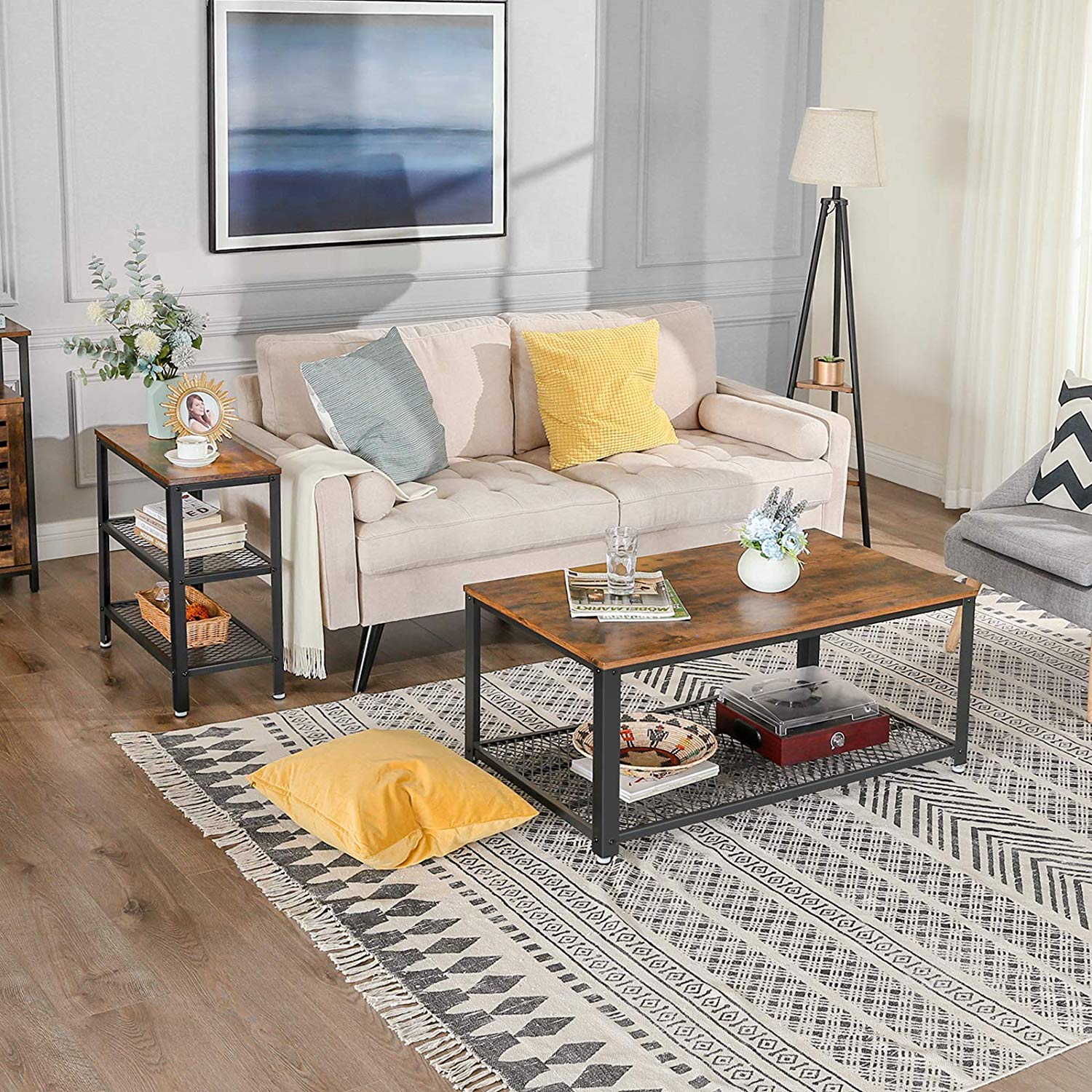 Vintage brun bordsskiva och svarta stålaccenter skapar en stilren och modern helhet.