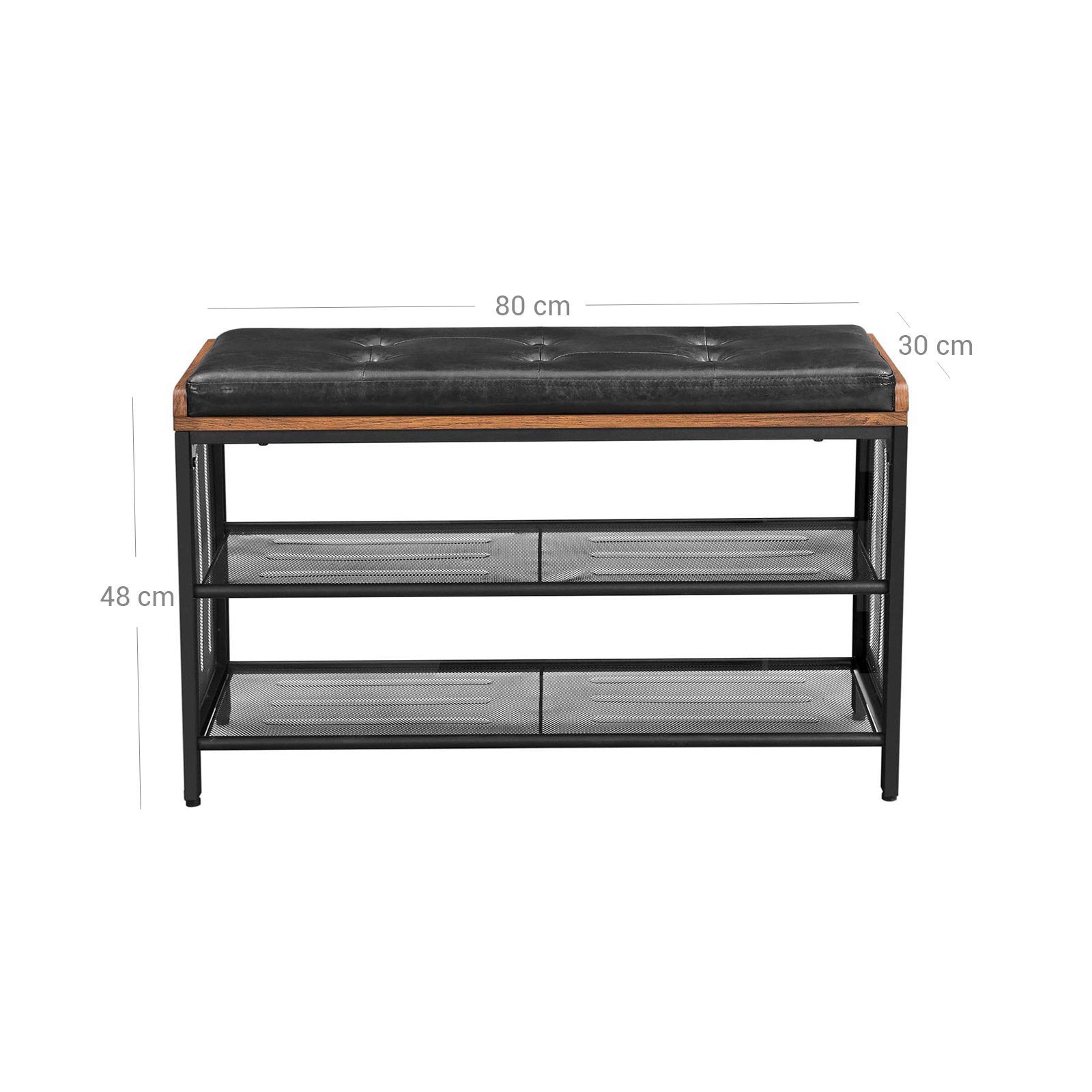 Skobänk i industriell stil med blankt svart konstläder och 2 täta näthyllor i järn för skoförvaring