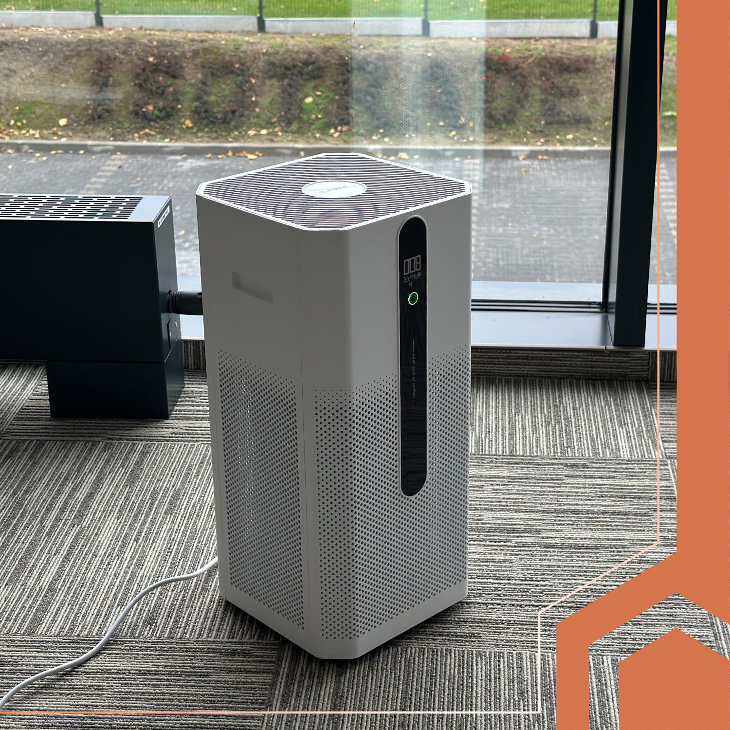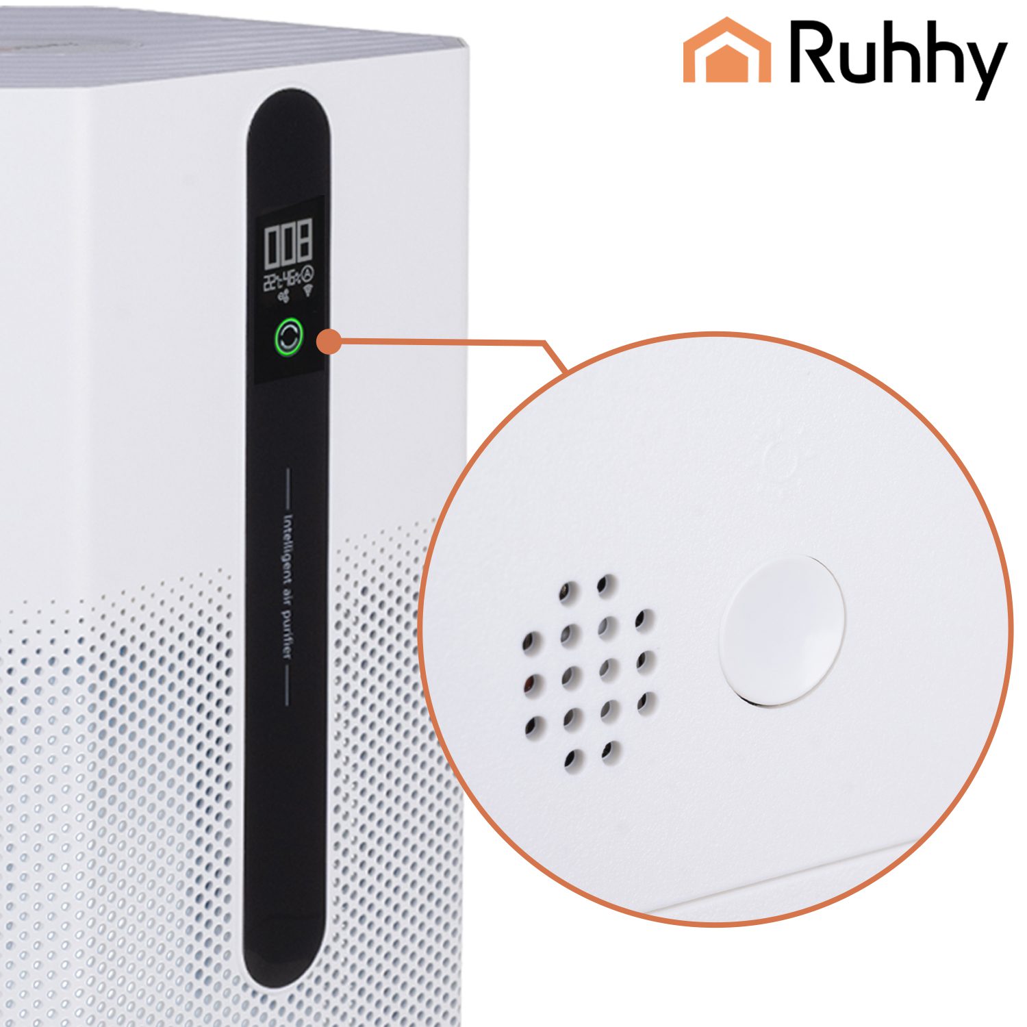 - Intuitiv kontrollpanel med färgindikator för luftkvalitet (grön/gul/röd) och tydlig PM2.5-display.