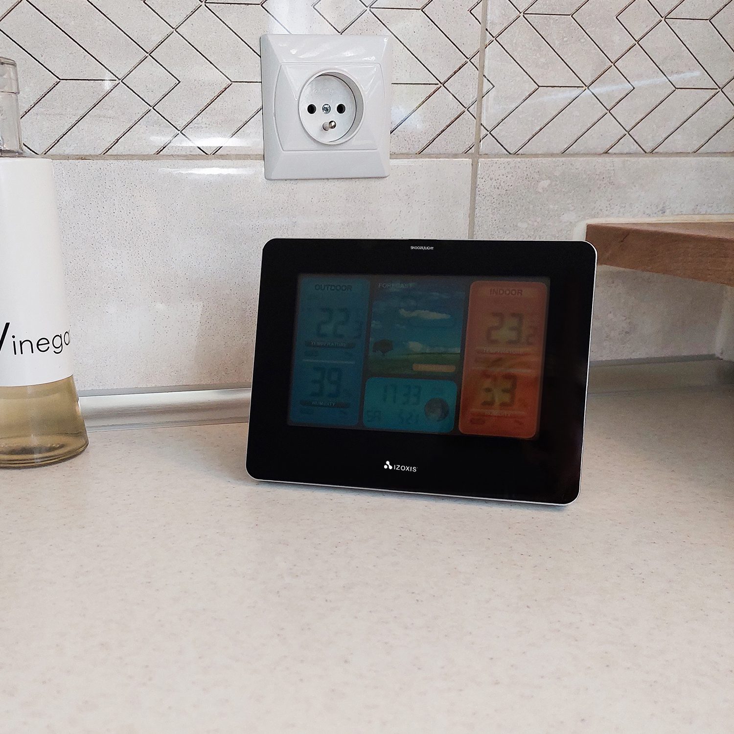 Den bakbelysta färgskärmen ger en tydlig och estetisk presentation av alla data – och lyser konstant när du använder den medföljande strömadaptern. Perfekt för kök, vardagsrum, kontor eller sovrum.
