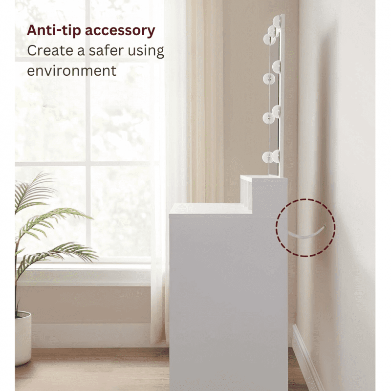 Tipsskydd medföljer för att kunna fästa sminkbordet i väggen och öka säkerheten