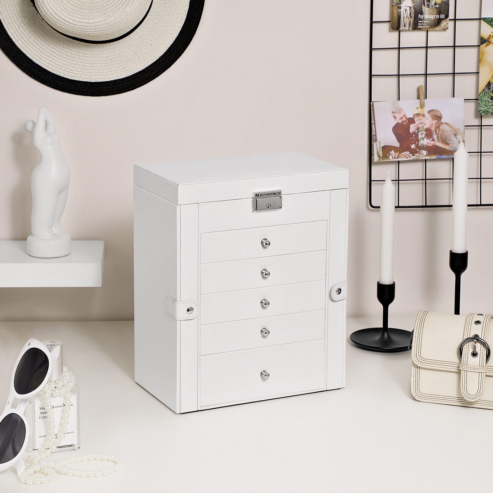 Elegant smyckeskrin i minimalistisk design med vit yta och glänsande metalldetaljer som lyfter sminkbordet