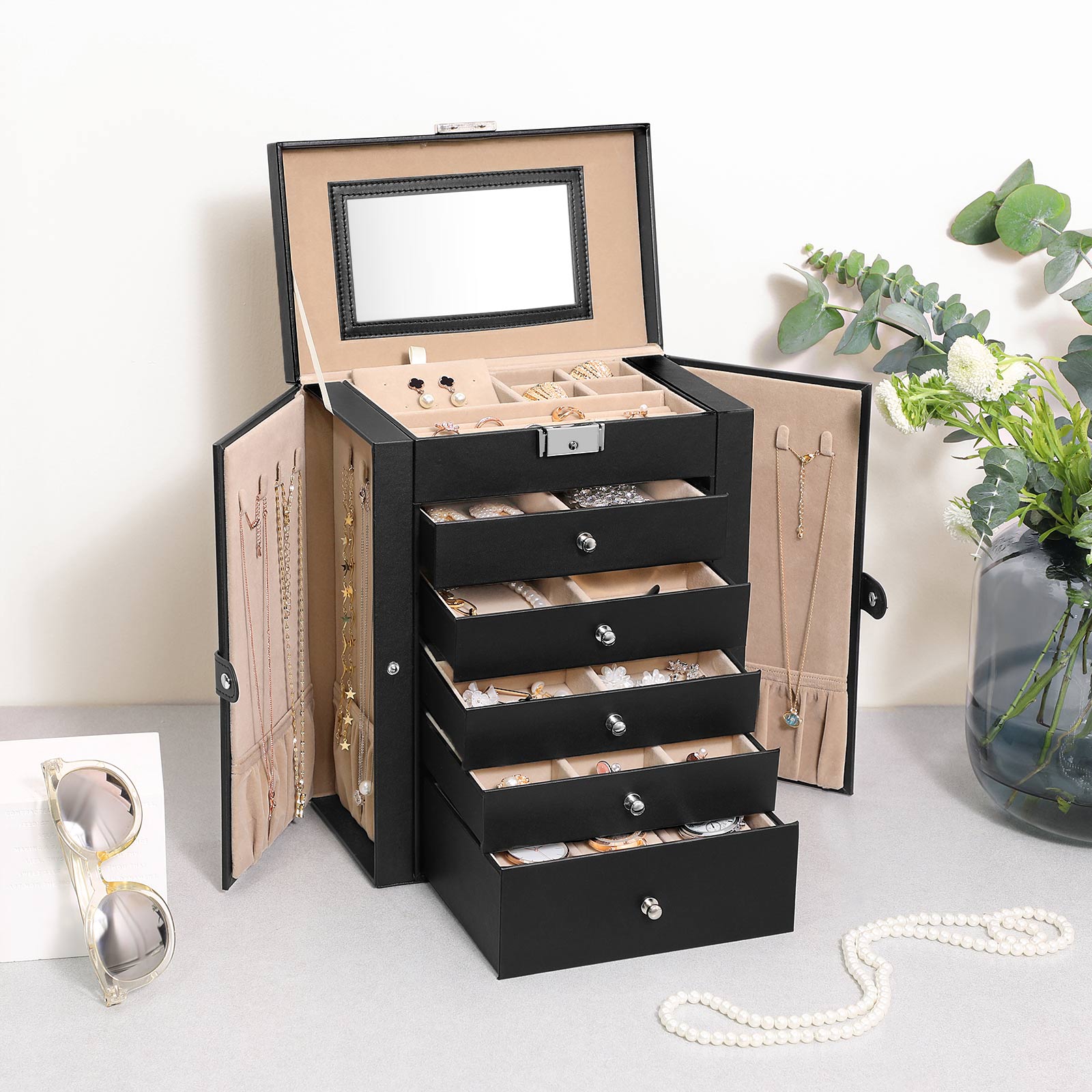 Rymligt smyckeskrin med 6 nivåer och 2 vikbara sidovingar som ger gott om plats för alla dina smycken.