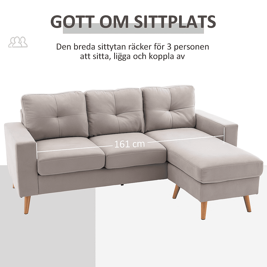 - 3-sits Hörnsoffa: Bredd 161 cm, med vändbar schäslong som kan placeras på både höger och vänster sida.