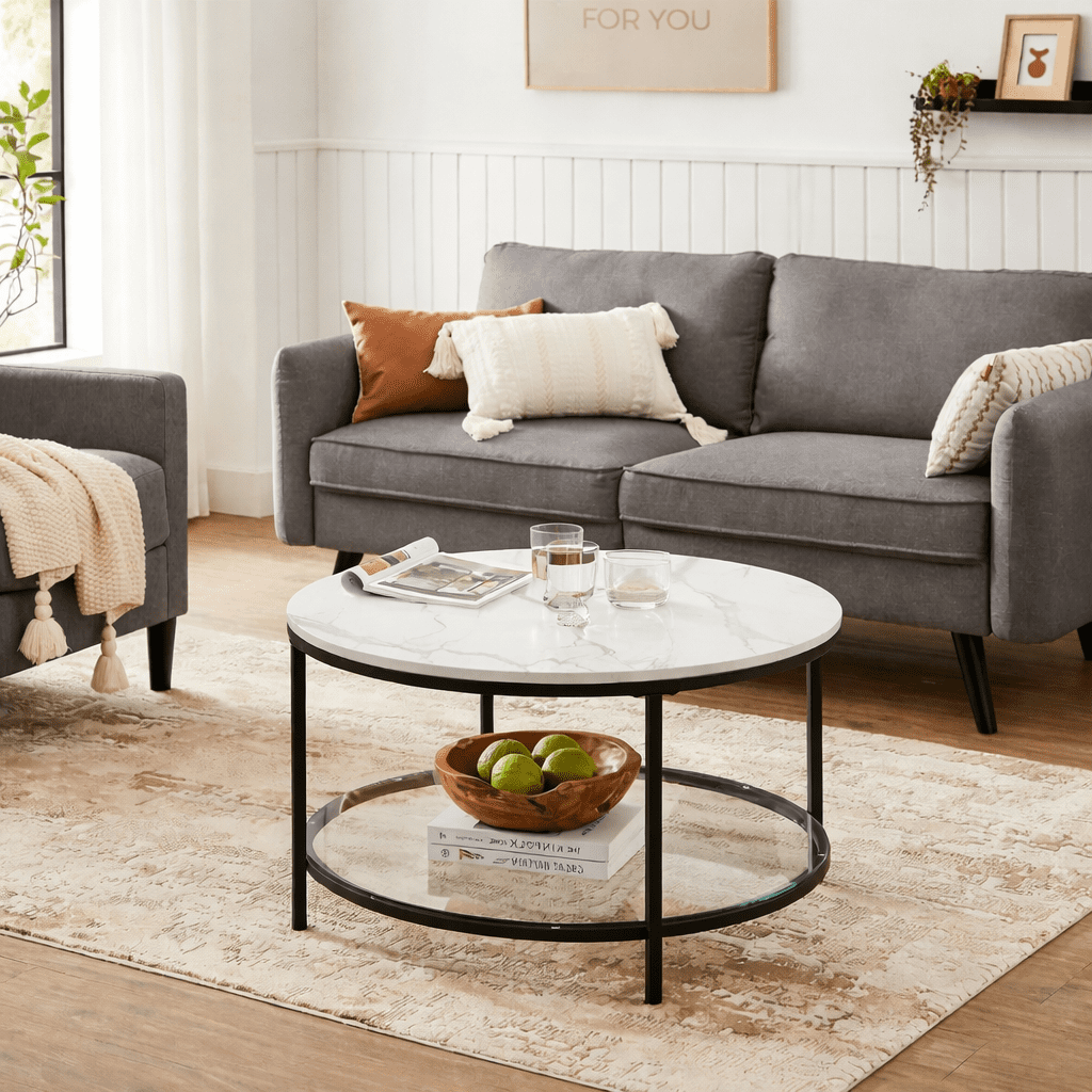 Runt soffbord med vit marmoreffekt och klassisk svart stomme som ger en modern och elegant känsla i vardagsrummet