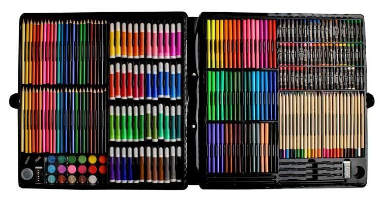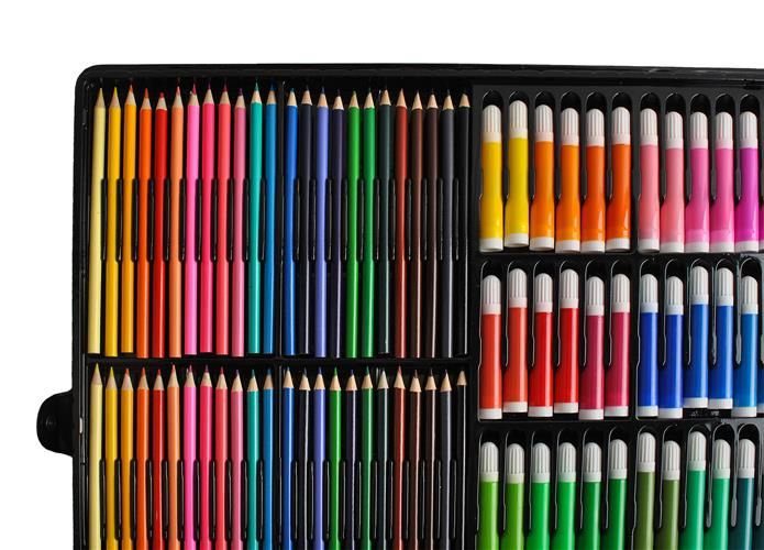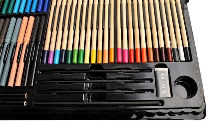 ✔ MÅNGA KOMPONENTER – målarsetet i resväskan innehåller ett stort antal delar: 60 vaxkritor, 24 pasteller, 24 träkritor, 24 vattenfärger, 2 penslar, pennvässare, sandpapper, suddgummi samt två HB- och 2B-pennor.