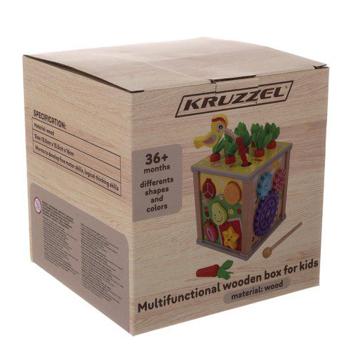 Kuben innehåller färgglada träklossar i olika former som barnen kan plocka i, sortera och undersöka. Tack vare de runda kanterna och det robusta träet är den trygg, tålig och perfekt för små händer.
