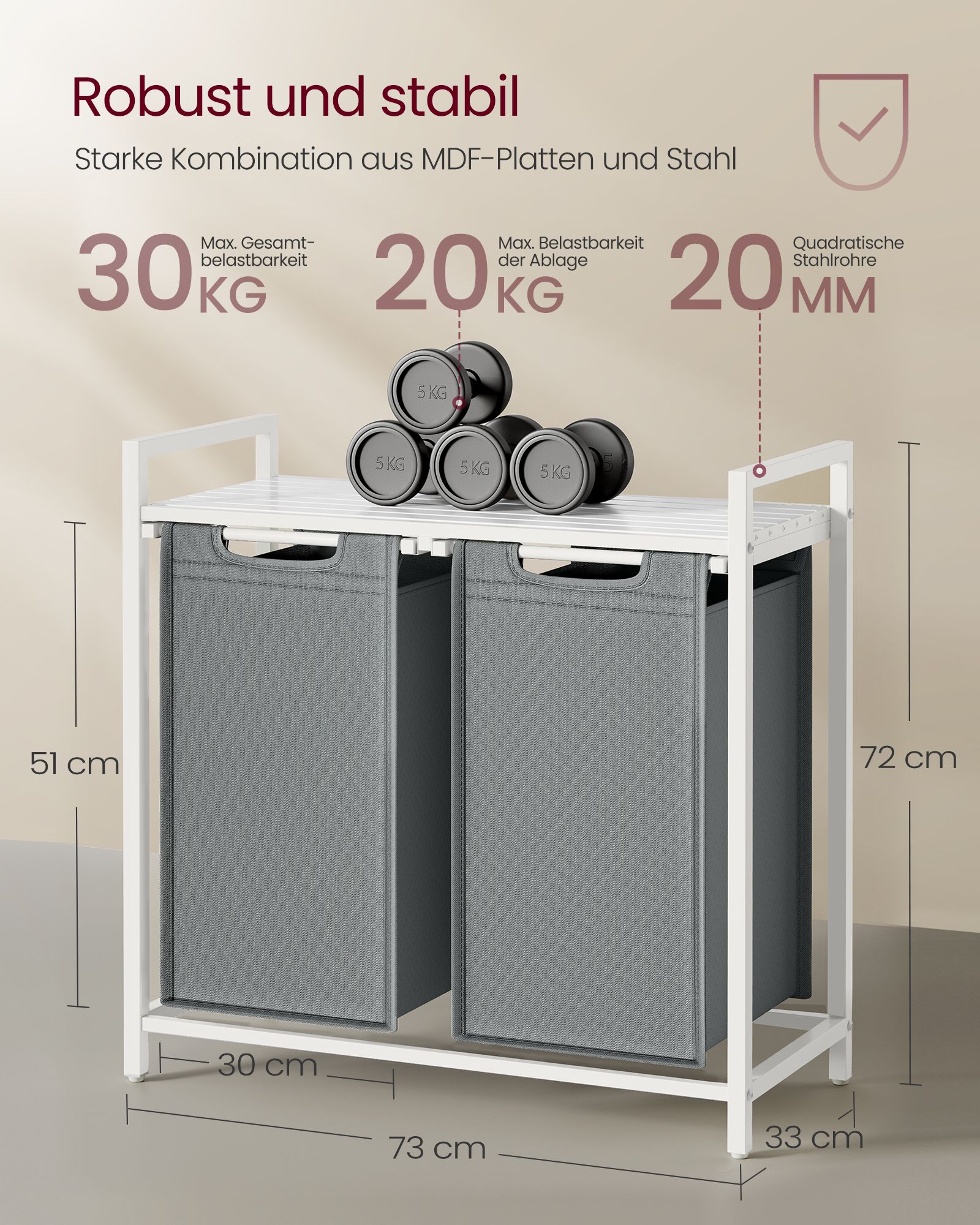 Tvättkorgsställ med dubbla fack och tygpåsar i slitstarkt Oxford-tyg som är vattenavvisande, robust och hållbart