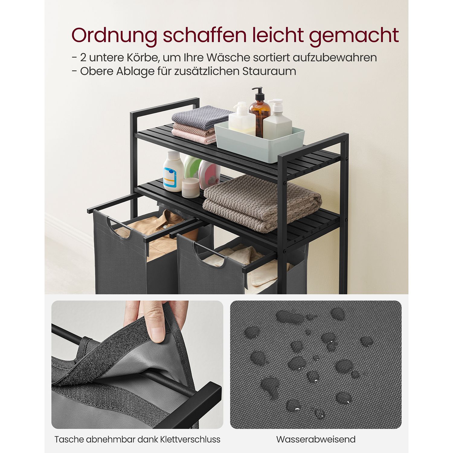 Stabil konstruktion i MDF och stål med tvättpåsar i slitstarkt Oxford-tyg för daglig användning.