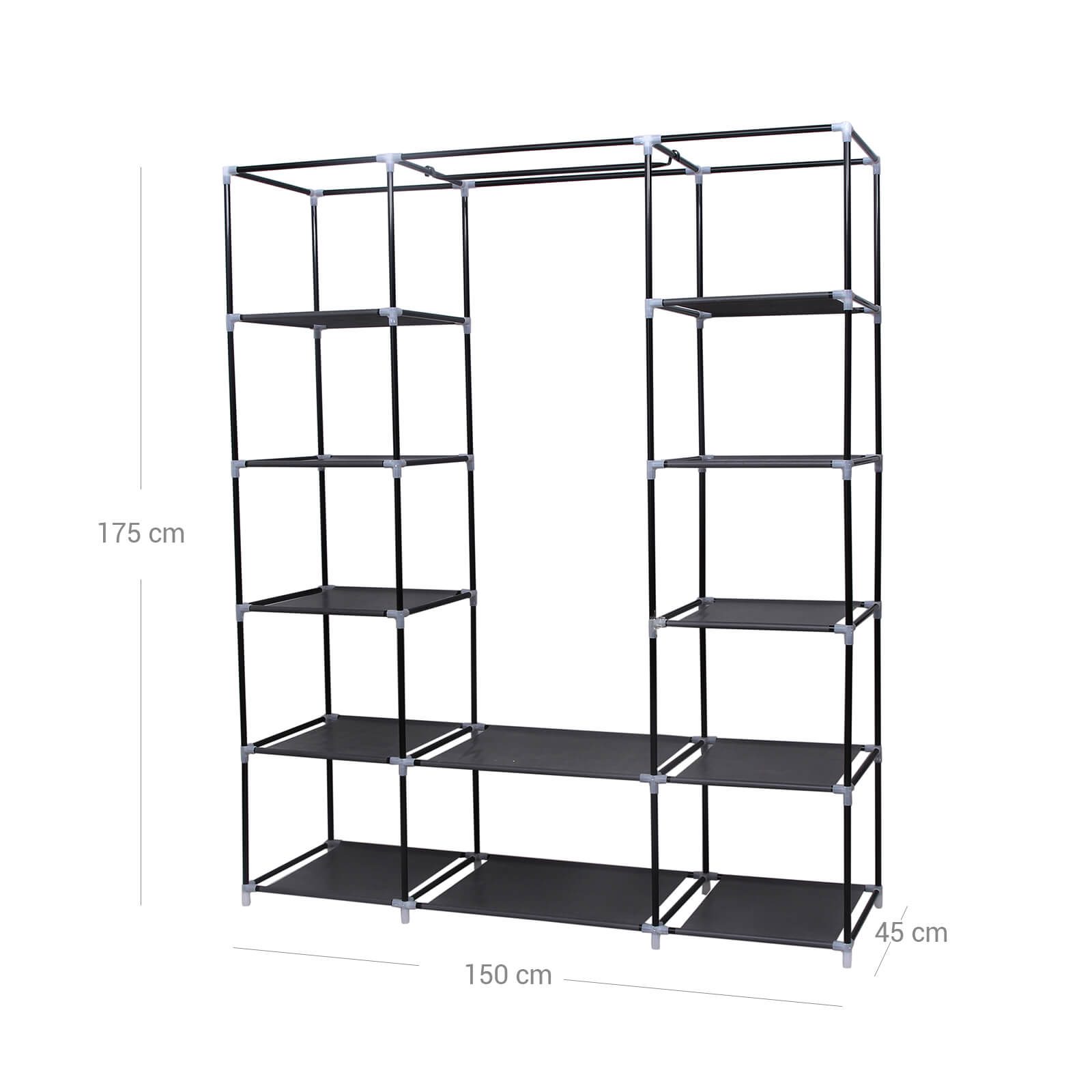 Rymlig design (150 x 45 x 175 cm) med 2 flyttbara klädstänger och flera hyllor som ger plats för både längre plagg och vikta kläder