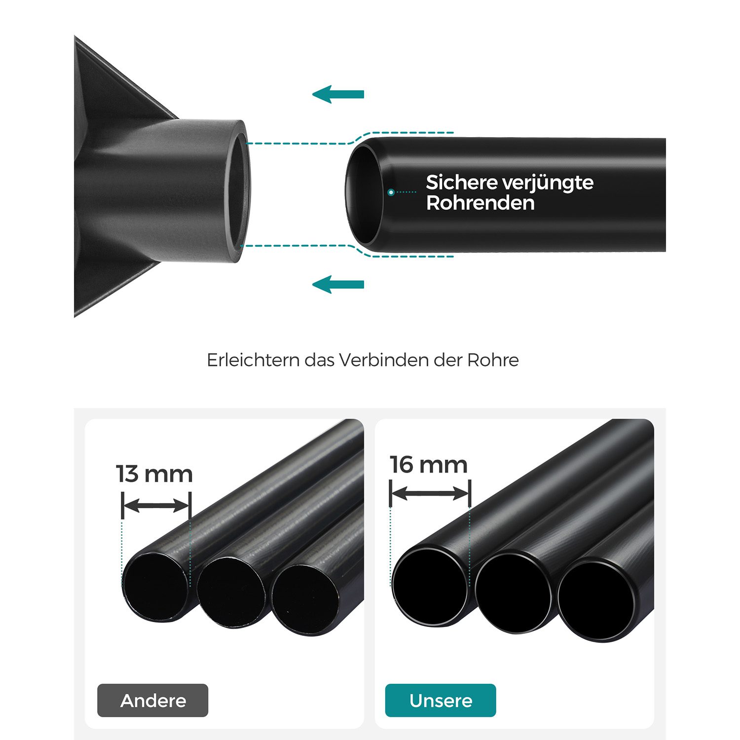 Stabil stomme med kraftiga metallrör (16 mm) som är enkla att trycka in i kopplingarna tack vare lätt avsmalnande ändar