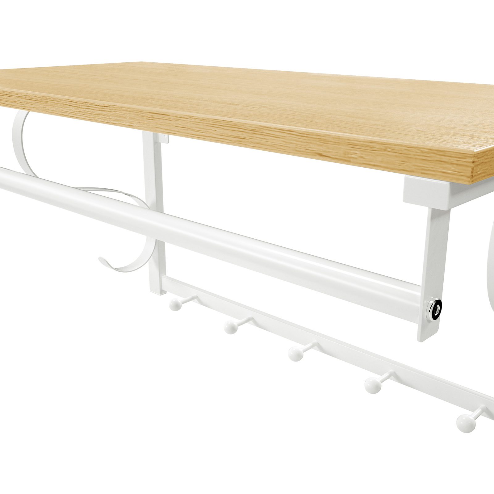 Stilren vägghylla med klädstång som kombinerar avlastningsyta och upphängning på liten yta