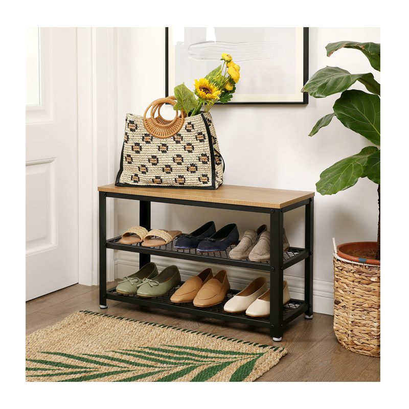 En rustik skobank i trä med två öppna hyllor, perfekt för hallen eller entrén.