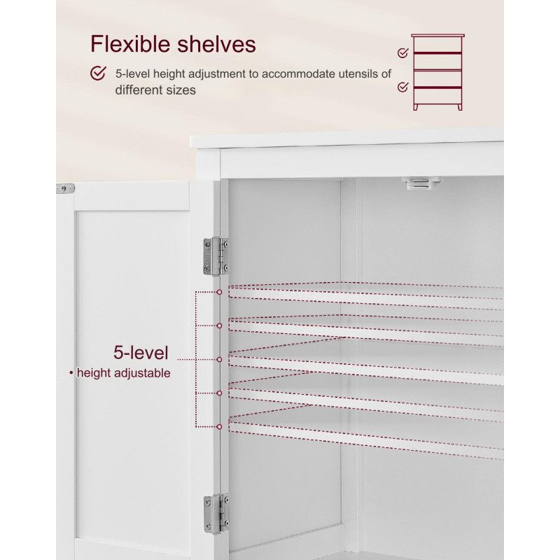 Anpassningsbar förvaring där hyllan i varje skåp kan justeras i 5 olika höjdlägen för att passa produkter i olika storlekar