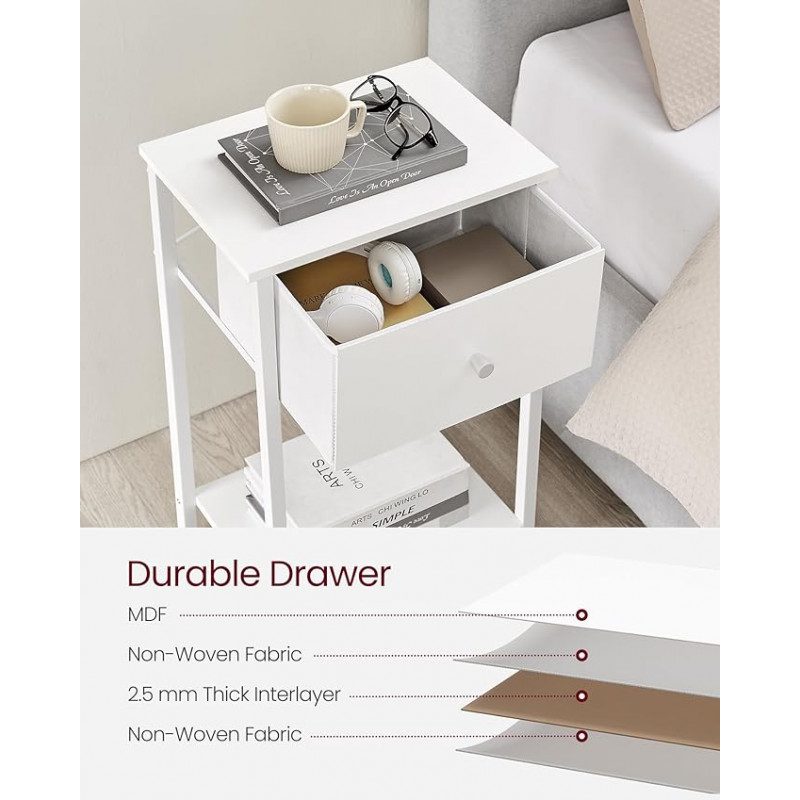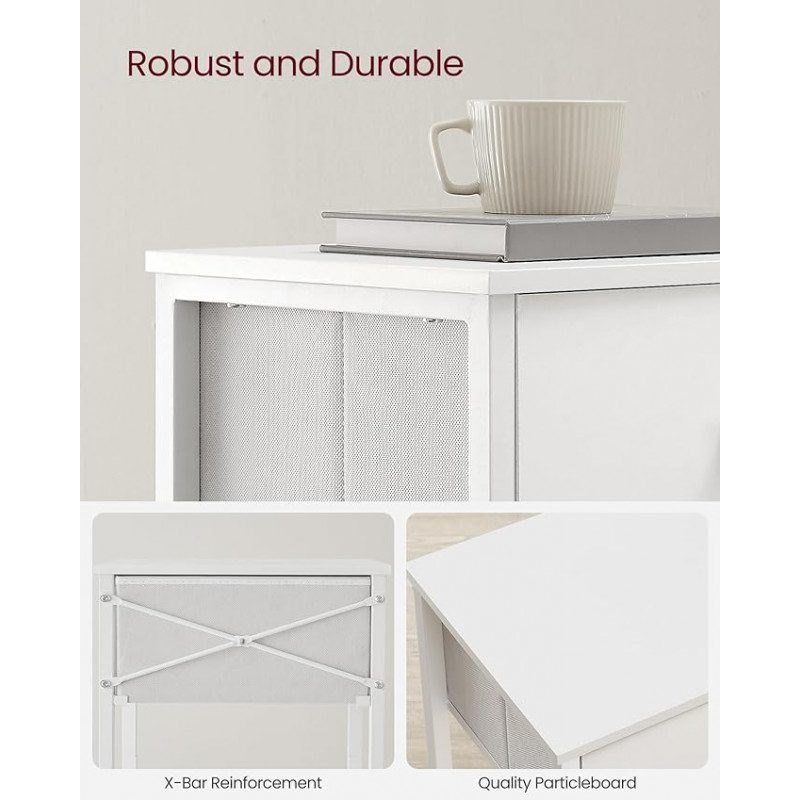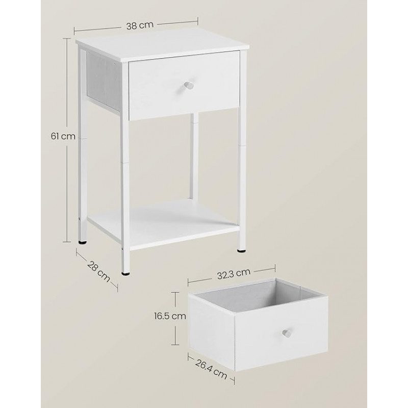 Ge ditt sovrum eller vardagsrum ett lyft med detta eleganta och funktionella vita sängbord med förvaringslåda i tyg. Den rena, minimalistiska designen gör att bordet smälter in i de flesta moderna inredningsstilar — samtidigt som den praktiska förvaringslådan hjälper dig hålla ordning. Tack vare sina kompakta mått (28 × 38 × 61 cm) passar det lika bra i en liten lägenhet som i ett större hem.