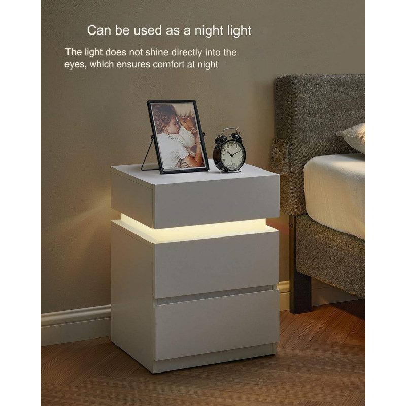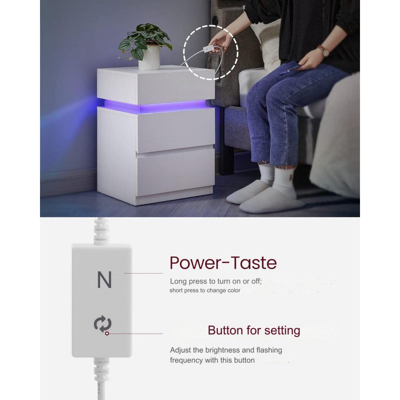 Vitt sängbord/sidobord med inbyggd LED-belysning som skapar rätt stämning i rummet