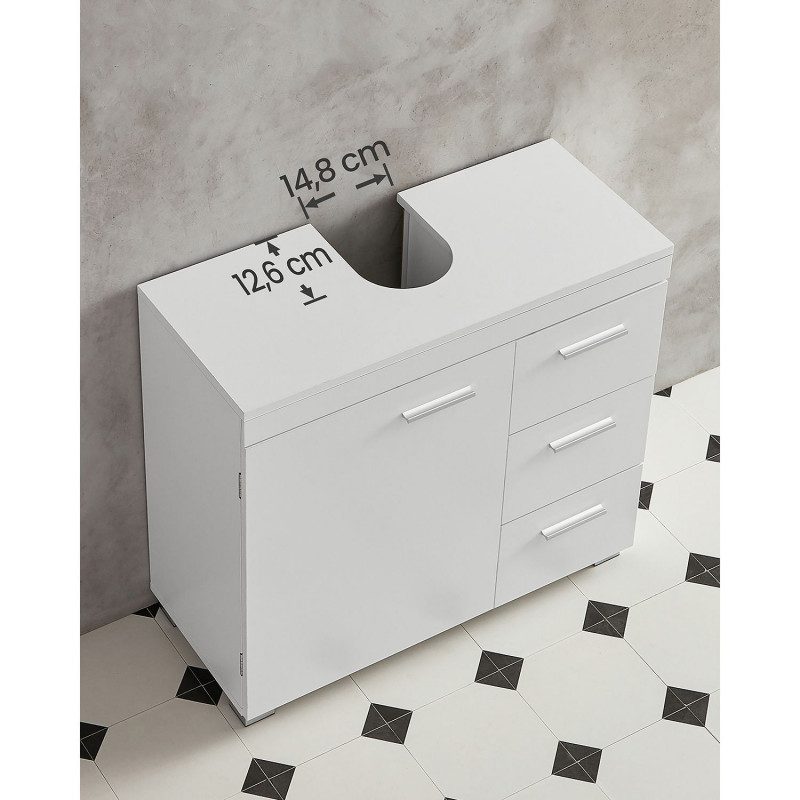 Tvättställsunderskåp i vitt med smart förvaring som håller badrumsartiklar och handdukar organiserade